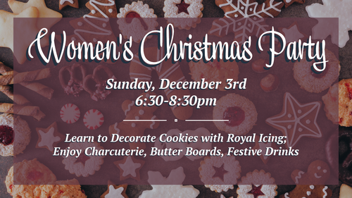 You're invited to our Annual Women's Christmas Party. Invite a friend and join us for a night of delicious snacks while we learn from our own Harmony Smith how to decorate Christmas Cookies with Royal Icing.